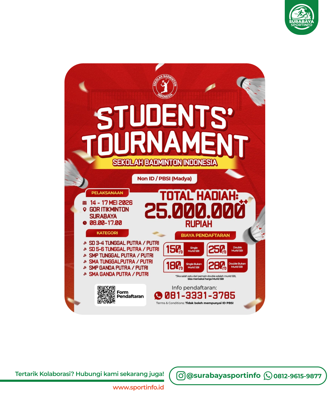 ๐ธ SIAP BERTANDING? Sekolah Badminton Indonesia menghadirkan ๐ฅ STUDENTSโ TOURNAMENT 2026 ๐ฅ...
